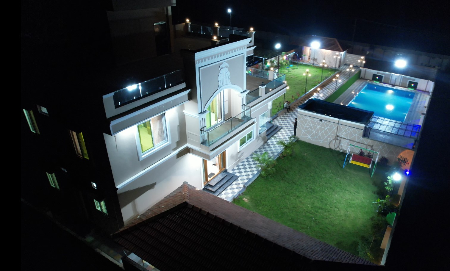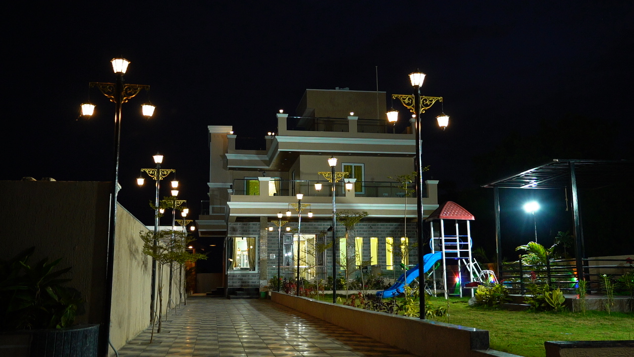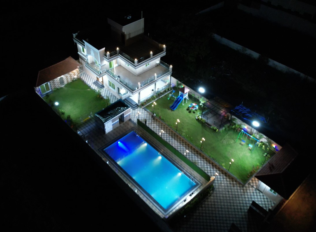 Lawn Gazebo, Rain dance setup near swimming pool, Open kitchen for big functions, CCTV Cameras