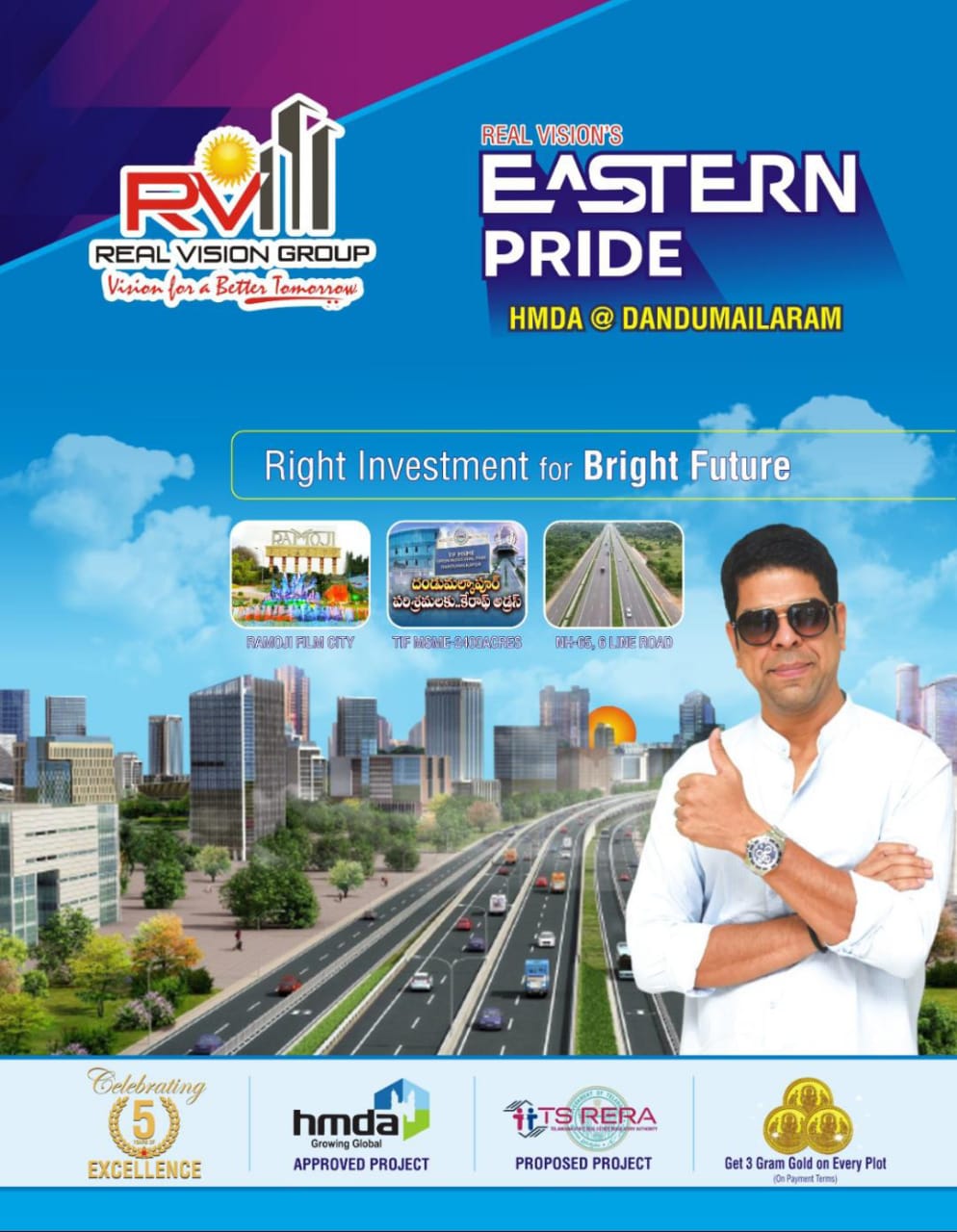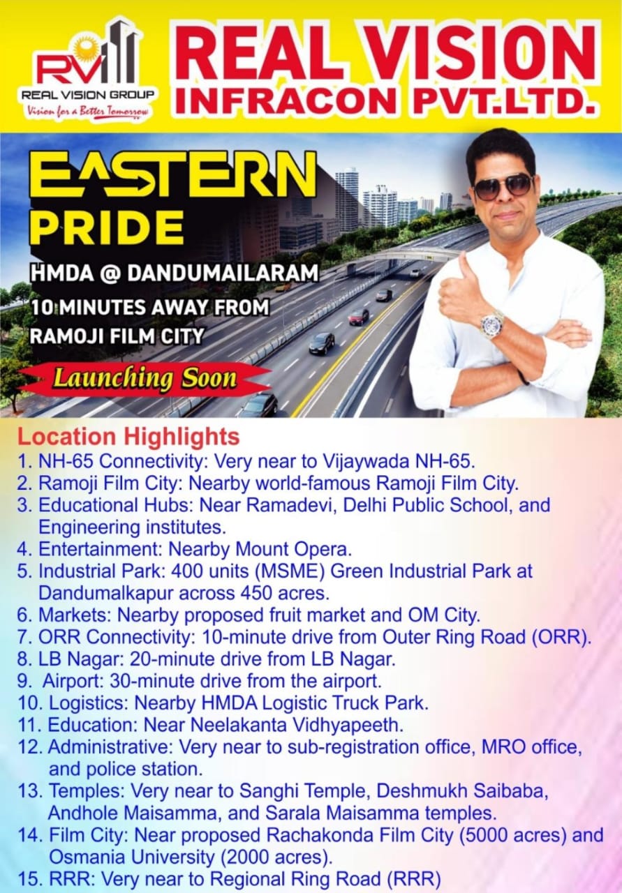 EASTERN PRIDE DANDUMAILARAM + 91 90102 96944 M.NAGESWARA RAO Property Code: MN-0001 Call for pricing Real Vision’s Eastern Pride HMDA Open Plots in Dandumailaram comes under the Rangareddy district. The Concept of our projects is unique and one of its kind where there is a lifetime earning opportunity for the investors.Location HighlightsGuinness World Record - Ramoji Film City 2000 Acres, World Largest Film Studio ComplexAdjacent to Asia's Biggest (2400 Acres) TIF MSME Green Industrial ParkVery near to 8 Lane Highway NH 6530 Min. Drive from LB Nagar Metro Station30 Min. Drive from TCS Adibatla30 Min. Drive from Wonderla Amusement Park30 Min. Drive from Foxconn Company5 Min. Drive from Mount Opera Amusement Park30 Min. Drive from RGI Airport15 Min. Drive from Madharam IT Hub30 Min. to Infosys - Ghatkesar10 Min. Drive from HMDA Logistics30 Min. Drive from ORR Exit No.11Near by HMDA Logistics Truck ParkNear by Fruit MarkMetro Rail Proposed from RFCNear by - Educational Hub. No of Engineering Colleges and International SchoolsProposed 8 lane Express Highway from LB Nagar to Toll RoadCloser to Pharmaceuticals and Laboratories like SRINI, DIVIS, NOSCH20 Min. Drive from Proposed Reginal Ring Road Related Properties List your Property with BrickZ Realtors WhatsApp us to know more: +91 63035 22231 +91-628-199-4649 ₹ 1,180.00 Luxury Independent House for Sale in Vanasthalipuram, Hyderabad Fully furnished with elevator and 5 Cars Parking Authorised consultant: Bachu Srinivas Gupta : +91-939-690-8353 ₹ 4,20,00,000.00 Luxurious Independent House for Sale in Yapral, Hyderabad Luxurious Independent House for Sale in Yapral, Hyderabad Owner contact number : Deepak Gautam +91-630-1678-451 ₹ 2,70,00,000.00 LUXURY Farm House in Moinabad, Hyderabad LUXURY Farm House in Moinabad Owner contact: Syed Nadeem : 950247647 ₹ 27,00,00,000.00 4 BHK Villas in Mokila, Hyderabad Villa in Mokila, Hyderabad Owner Contact Number: Naresh : +91 -938-1224-358 ₹ 2,05,00,000.00 G+2 Independent House Vanasthalipuram, Hyderabad G+2 Independent House Vanasthalipuram, Hyderbad Owner contact Number : Bachu srinivas guptha 9396908353 ₹ 6,00,00,000.00 Independent Houses for Sale in Thurkayamjal, Hyderabad Independent Houses Owner contact number: D Akhil reddy : +91-913-3447-441 ₹ 1,20,00,000.00 G+1 Independent House for Sale in Alwal , Hyderabad G+1-Independent House for Sale in Alwal Owner contact number : PRASAD : WhatsApp +91-9885549765 Satya : 9177222339 ₹ 1,35,00,000.00